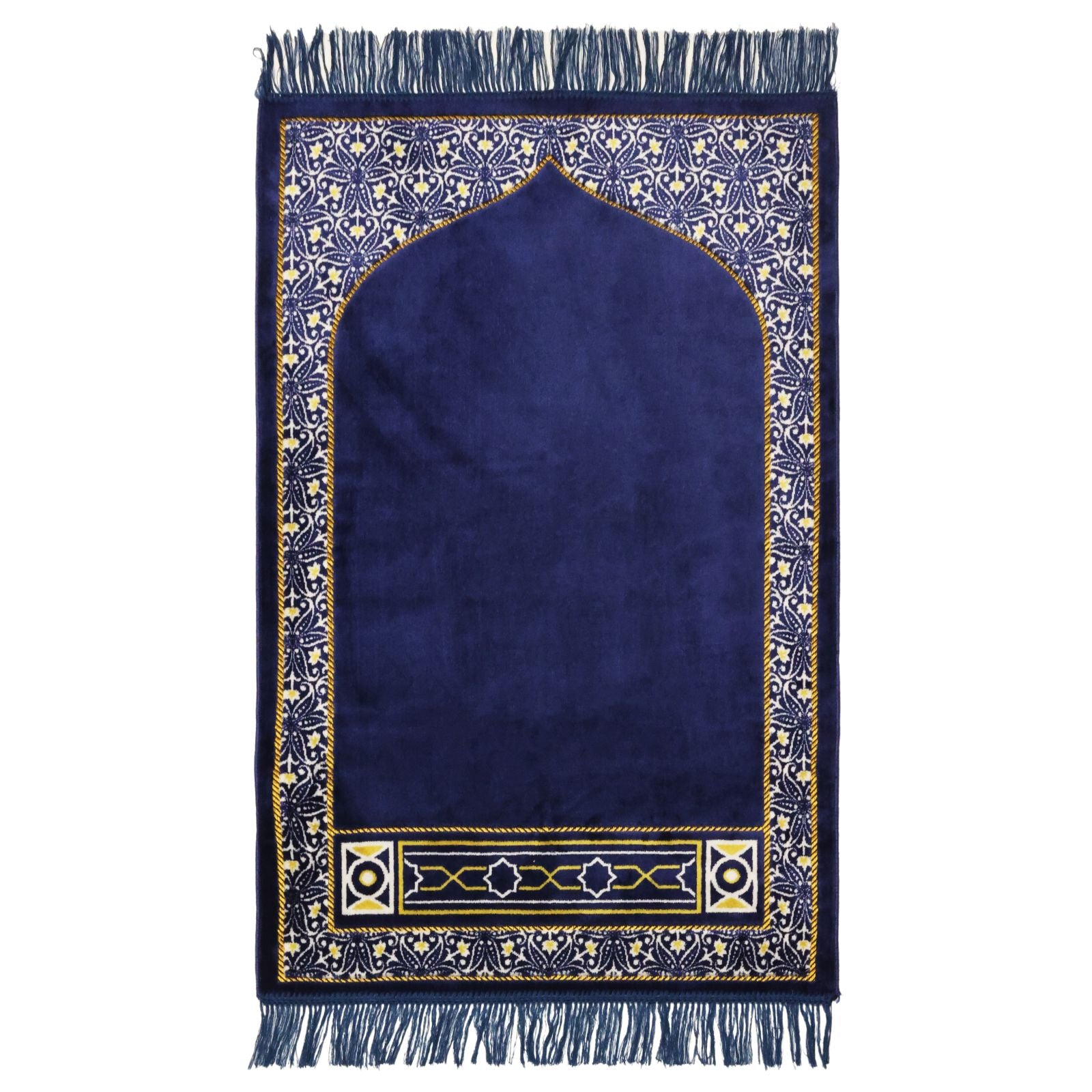This is a traditional Islamic prayer mat in both aspects of pattern and material. The dark background features a classic Islamic arch in the center, surrounded by rich Islamic vines. The pile is slightly longer and can be folded. It is made in Pakistan and is the basic model among the 4 Pakistani salat mats in the MyDina store.