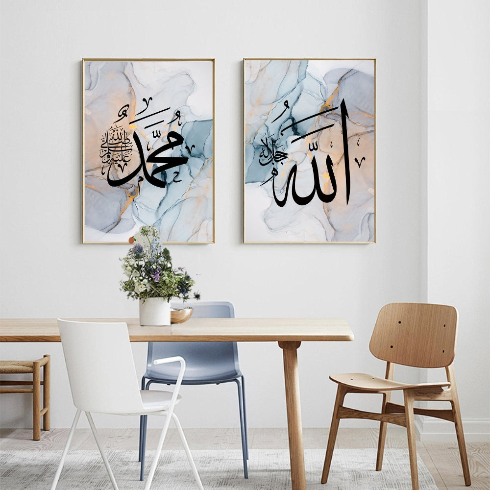 Modern Muslim Decorations: This blue and pink Islamic painting perfectly combines sacred scriptures, Arabic calligraphy and modern fashion elements to match your modern and beautiful home.