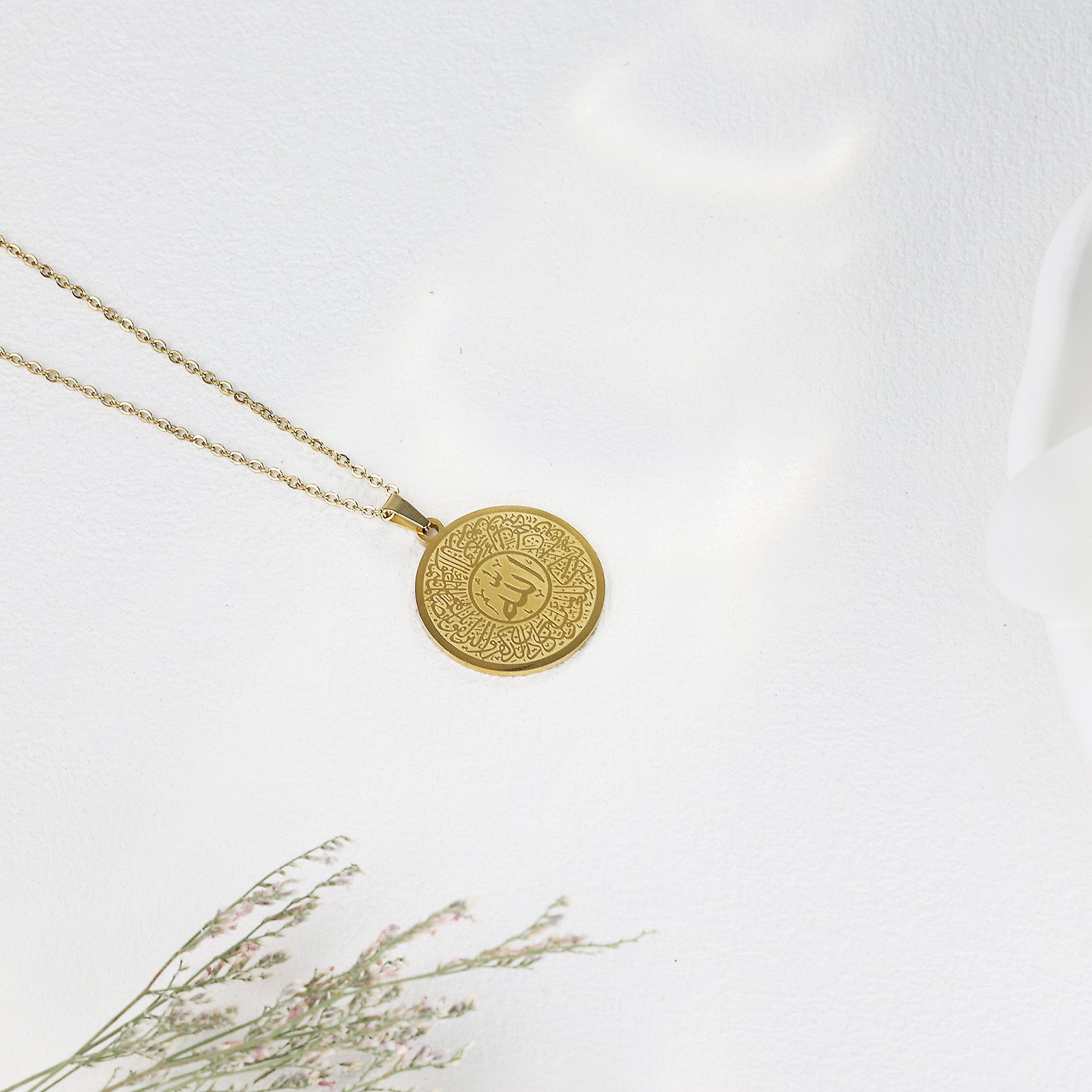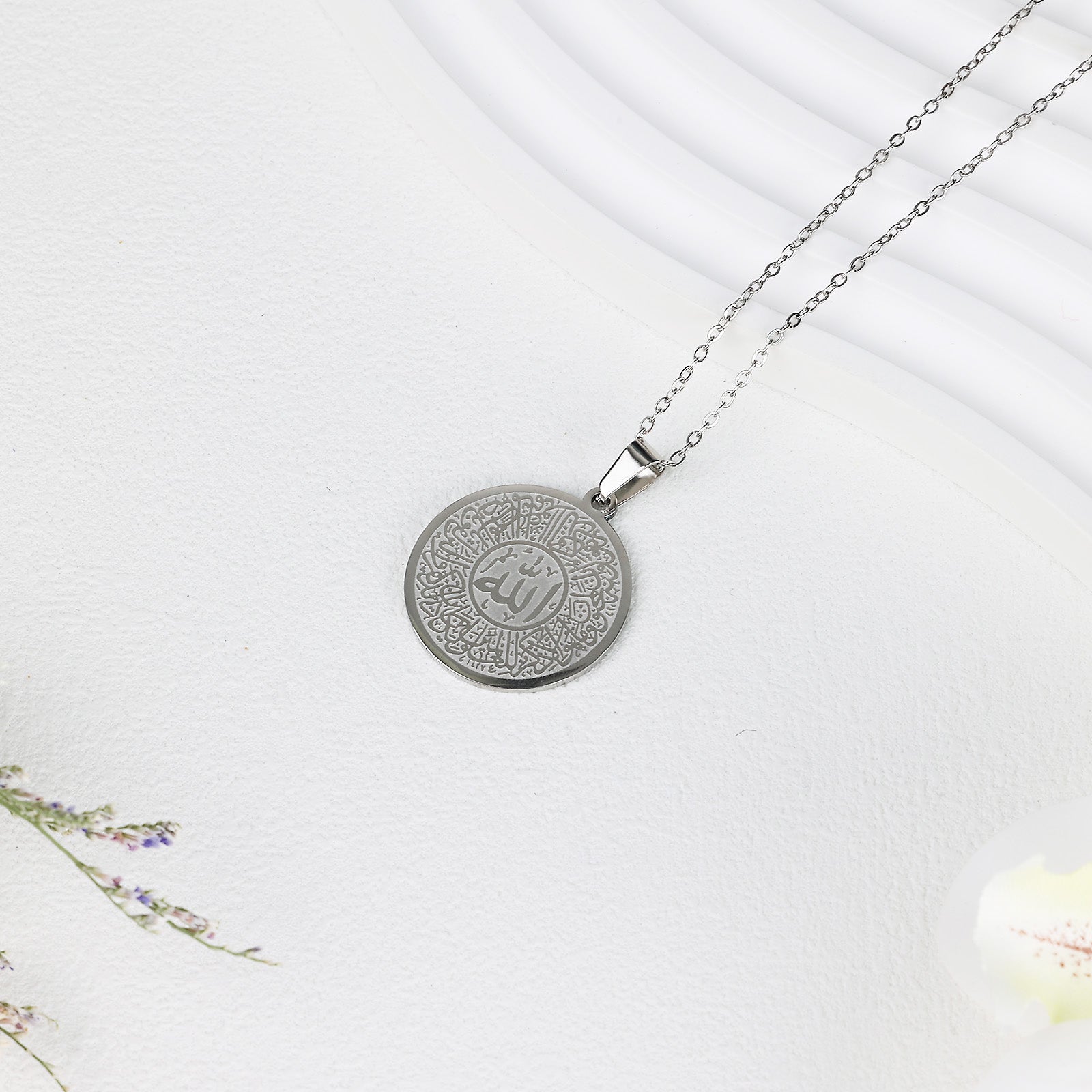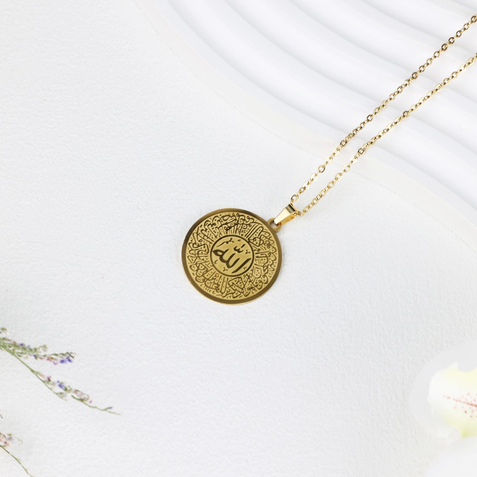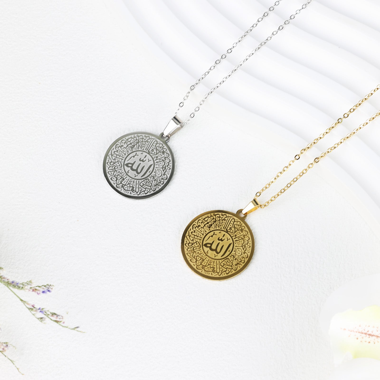 Design: The necklace features a round pendant with the Name of Allah and a verse written in Arabic calligraphy. This famous Quran quote is of great significance. The Islamic necklace accompanies you, reminding you to keep your faith.