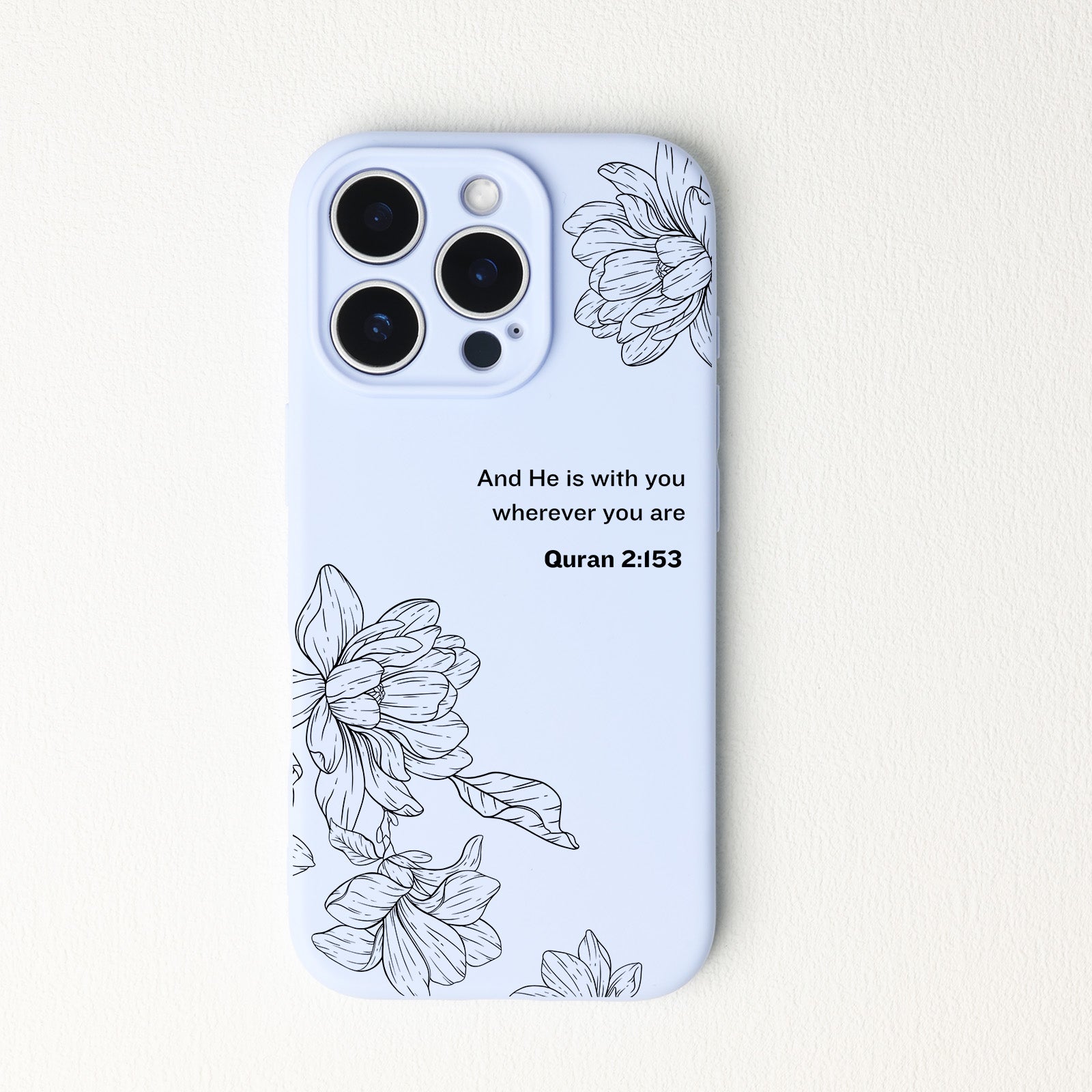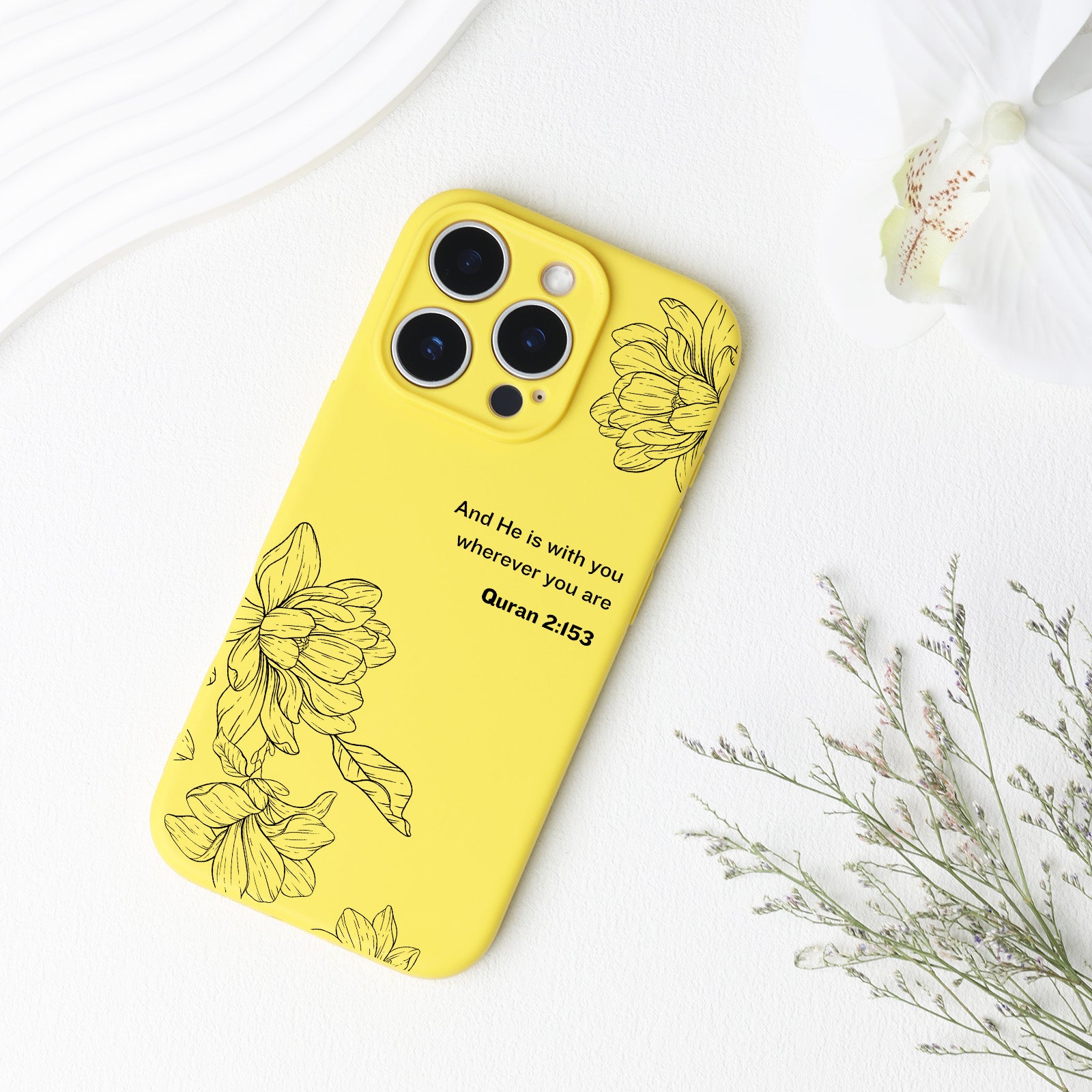 This phone case features a vibrant background, symbolizing warmth, hope, and positivity. The black hand-drawn magnolia flowers add an elegant and resilient touch, reflecting purity and inner strength. At the center of the design is a powerful Quranic verse (Quran 2:153): "And He is with you wherever you are."