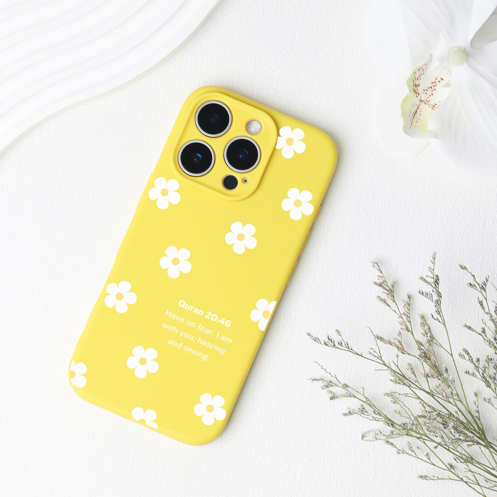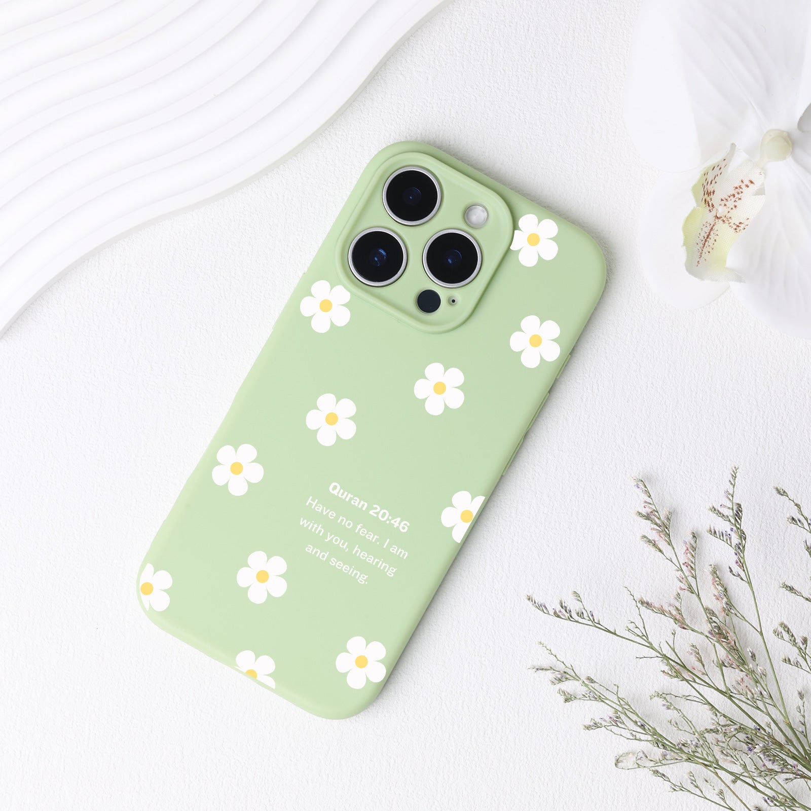 This phone case blends serenity and faith, featuring a soothing pure color background adorned with delicate white daisies, symbolizing purity and peace. At its heart, a profound Quranic verse (20:46) offers reassurance: "Have no fear. I am with you, hearing and seeing." The combination of soft floral elements and divine words creates a comforting reminder of Allah’s presence and protection. Designed for those who seek both elegance and spiritual strength, this case serves as a daily source of calmness and trust in life’s journey.