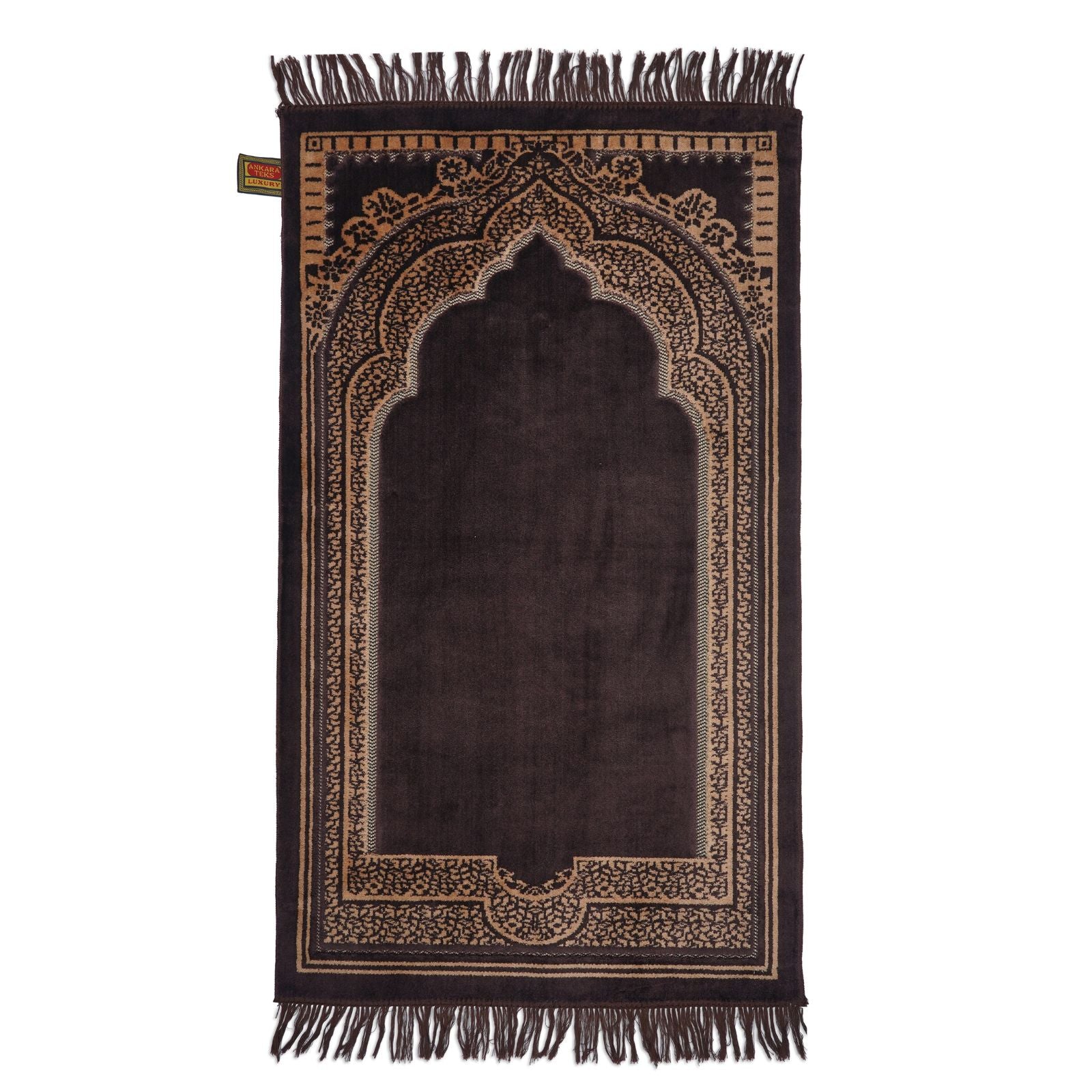 The brown background is matched with the beautiful and elegant golden Islamic windows frame, which is very harmonious and classic but not too serious. The pile is slightly longer and feels very soft. It is made in Pakistan and is the universal model among the 4 Pakistani musala in the MyDina store. It has a denser pile and more beautiful pattern than the basic one.